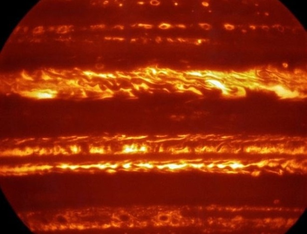 | Imagem de Júpiter, colorida artificialmente, foi produzida por um equipamento de megatelescópio que consegue estudar a luz infravermelha de objetos celestes |